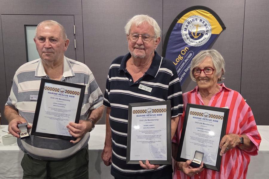 Marine Rescue Ballina has paid tribute to three of its most dedicated volunteers, awarding Life Membership — the organisation’s highest honour — to Lorraine Leuckel, Norm Lannoy and John Donoghue.