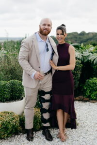 Above, Matt and his wife Zanthe and family now enjoying post pro rugby in Ballina. Main photo, Matt shows off his old jersey with Harcourts Ballina principal agent Natalie Leslie.